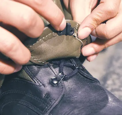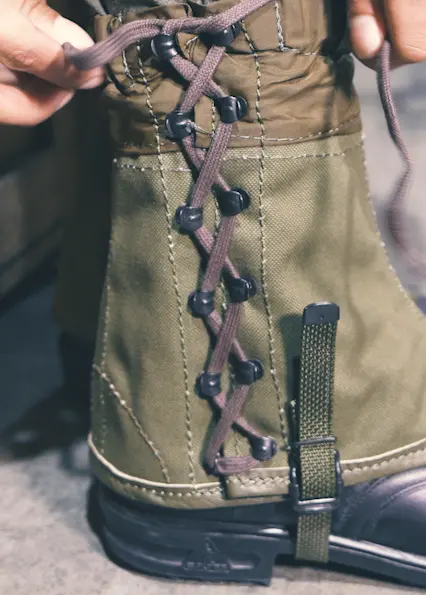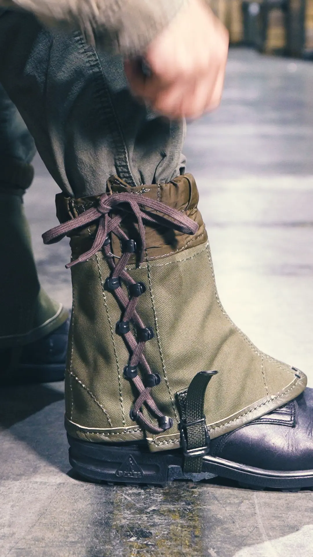 Fasten the side of the gaiter so the lace hooks line up. Starting from the bottom and working your way up, lace the boots until they are tight an secure.
