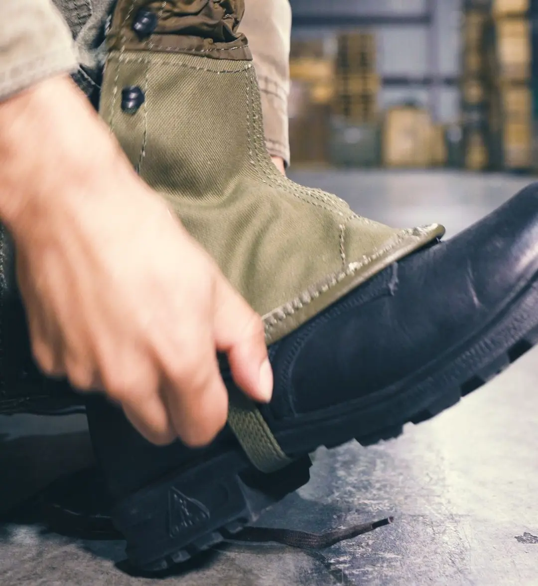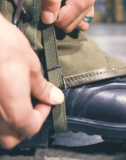 Slip on one pair of gaiters to any shoe or boot of your choosing. Make sure that the strap on the underside of the boot, the hook is facing forward and the laces facing outside.